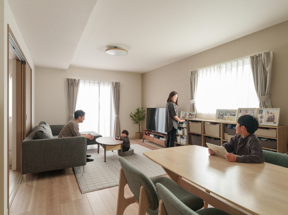 元気な声が響いても安心。家族の笑顔が広がる1階で暮らしが完結する間取り