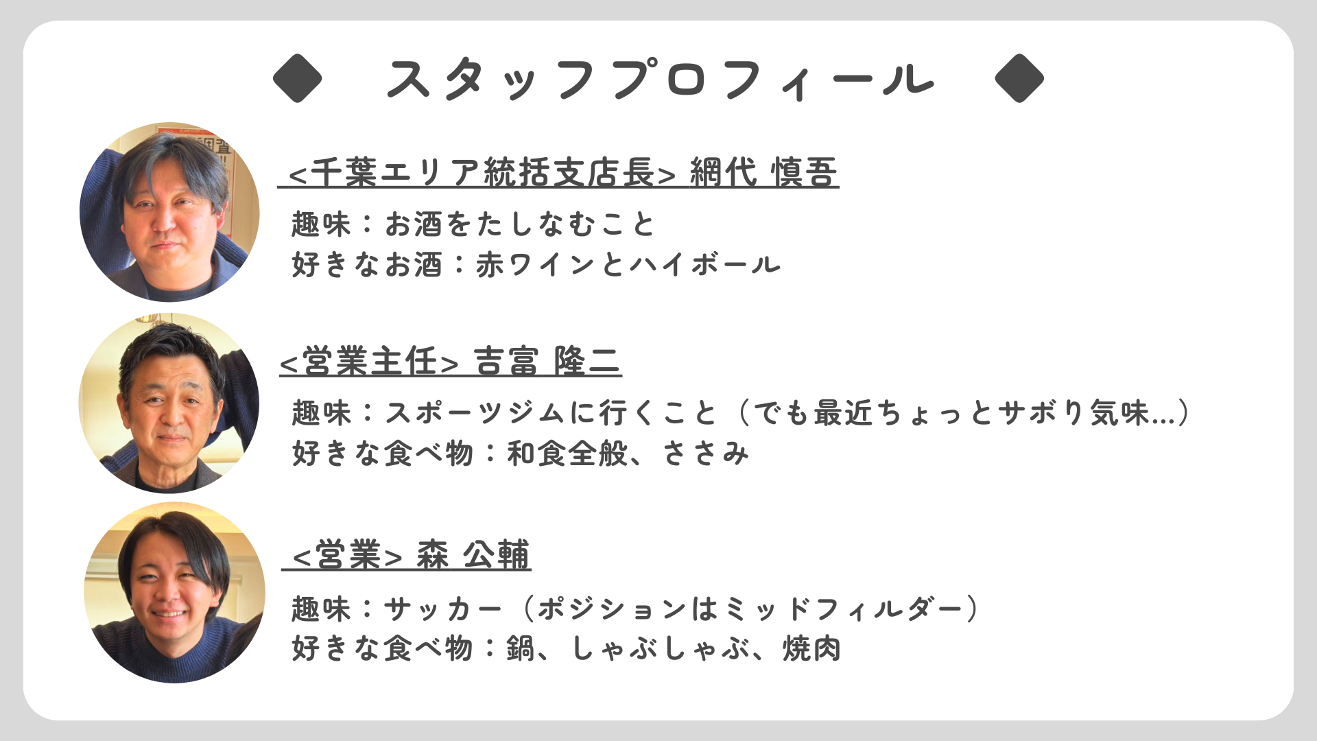 インタビューに答えてくれたのは写真右から、千葉エリア統括支店長の網代 慎吾(あじろ しんご)さん、営業の森 公輔(もり こうすけ)さん、営業主任の吉富 隆二(よしとみ りゅうじ)さんです。